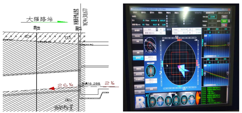 严控盾构始发姿态。盾构始发姿态决定了后续施工成败,是盾构施工重中之重。考虑到盾构机自身重心靠前,始发掘进时易产生向下的“磕头”现象,项目部将盾构始发轴线比设计轴线抬高20mm。此外,因车站底板自西向东为2‰纵坡,盾构进洞为26‰下坡。按照一般状况抬高始发轴线易导致侵限。项目查找合肥市轨道交通前期其他盾构隧道施工的经验,结合大强路站地质情况,调整盾构始发轴线,将盾构始发轴线抬高改为5‰下坡,有效避免了盾构管片侵限。