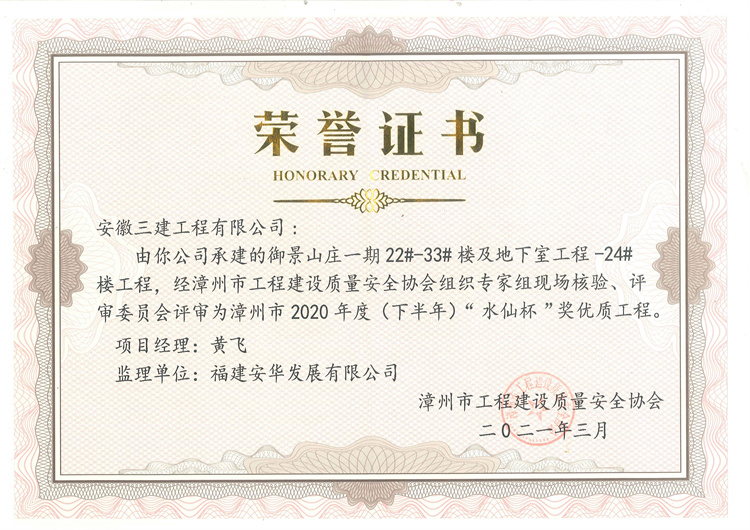 5月17日,公司收到漳州市工程建设质量安全协会寄来的奖杯和奖状,由安徽三建厦门公司负责实施的御景山庄一期22#楼-33#楼及地下室工程荣获“水仙杯”优质工程奖,该奖项是漳州市工程建设质量最高奖项。