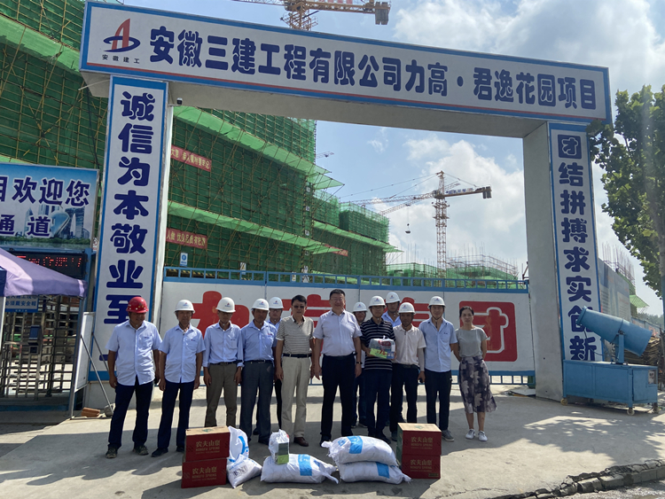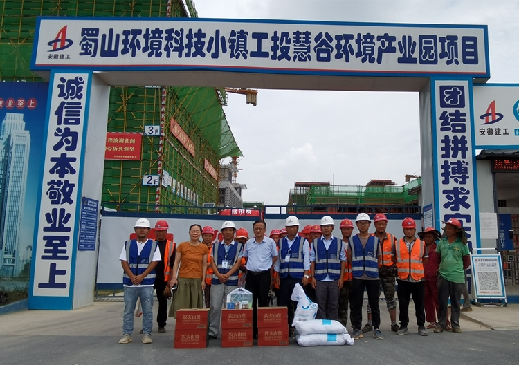 工投蜀山慧谷环境产业园项目正值主体结构施工阶段,现场施工人员多、作业面广,武朝晖来到施工现场,慰问项目管理人员及现场施工作业人员,给现场施工人员送来了清凉油、风油精、十滴水、绿豆、矿泉水等降暑防暑物资,并详细了解了项目目前进展情况及项目部在高温天气所采取的应对措施,要求项目部要严格按照公司防暑降温要求开展施工,同时做好常态化疫情防控。