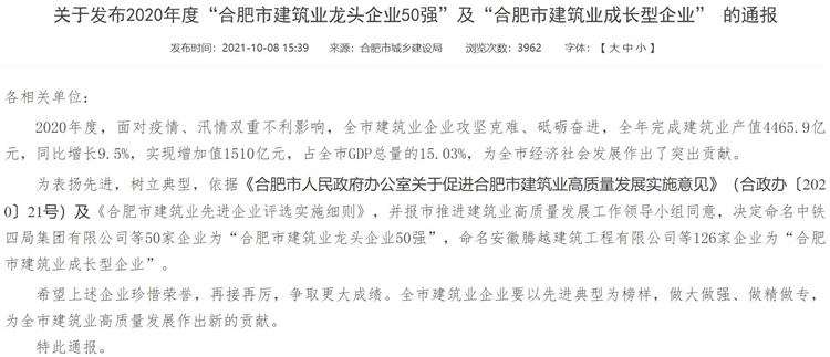 近日,从合肥市城乡建设局传来喜讯,公司喜获2020年度“合肥市建筑业龙头企业50强”荣誉称号,位列前三甲。