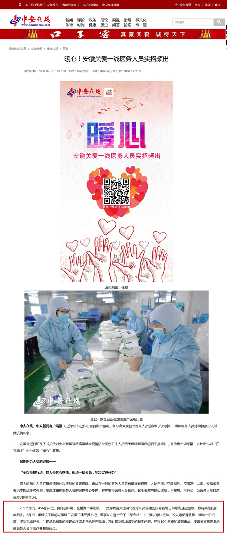 中安在线、央广网、中新网、国际在线——暖心!安徽关爱一线医务人员实招频出 发布时间:2020-02-26 来源:中安在线、央广网、中新网、国际在线 撰稿人: 浏览次数:16199 网址链接: 中安在线:http://ah.anhuinews.com/system/2020/02/22/008352394.shtml 央广网:http://news.cnr.cn/native/gd/20200222/t20200222_524987284.shtml 中新网:http://www.chinanews.com/sh/2020/02-22/9101239.shtml 国际在线: http://news.cri.cn/20200222/6faa4074-5d1b-ef06-5944-b8a7ca8d5931.html