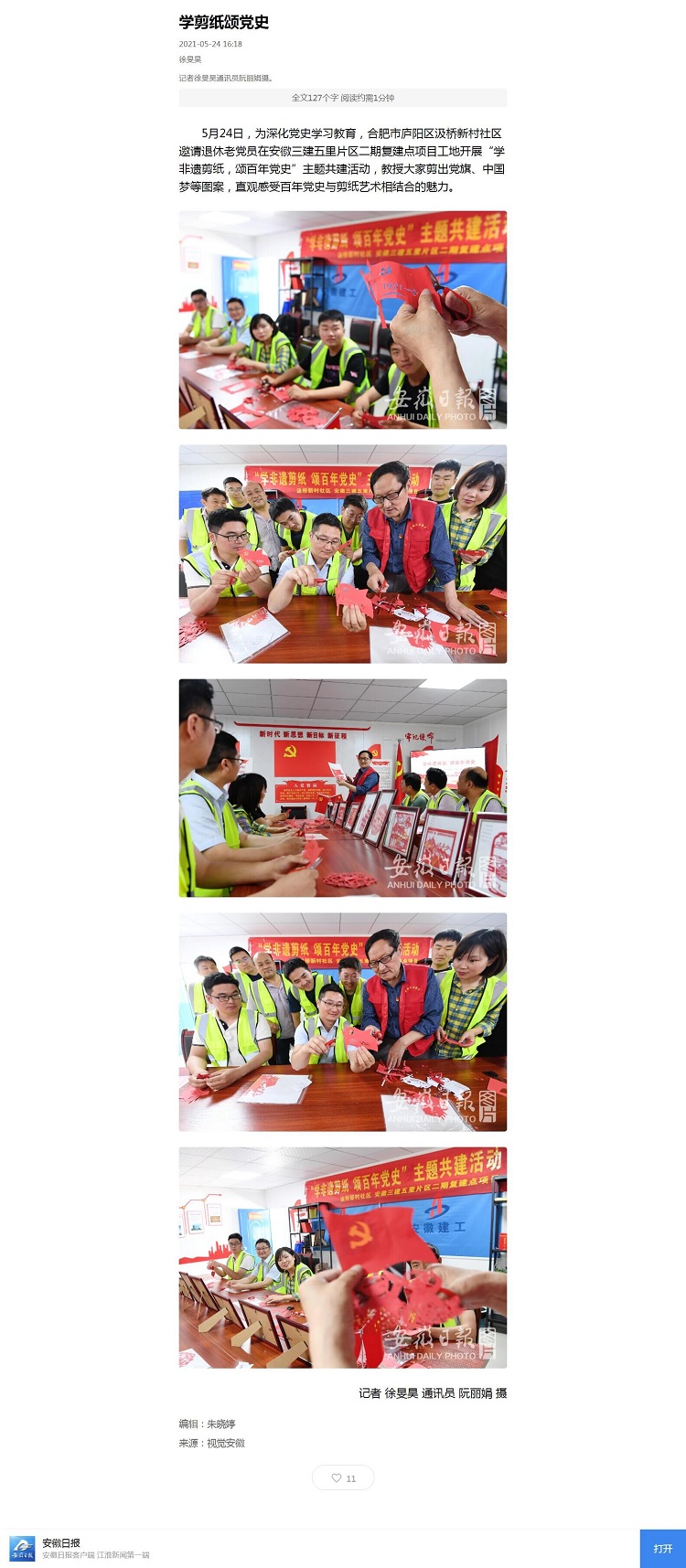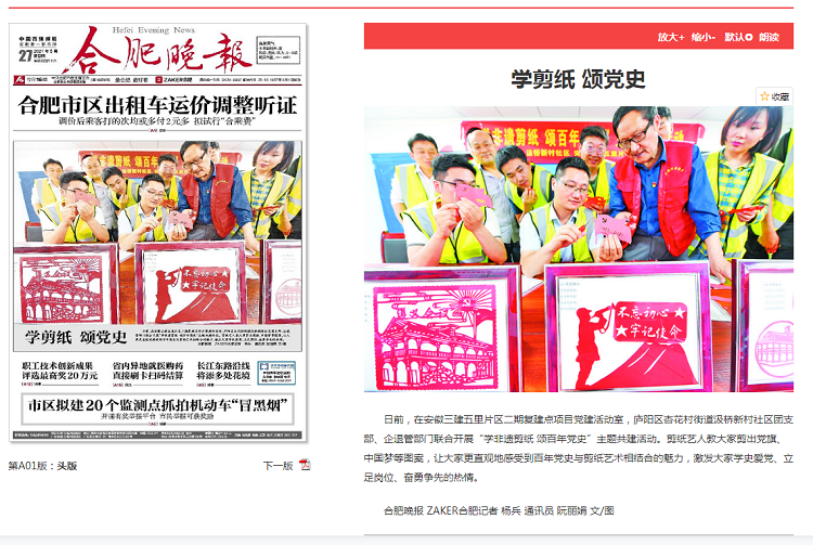 安徽日报、合肥晚报、安徽日报公众号——学剪纸颂党史