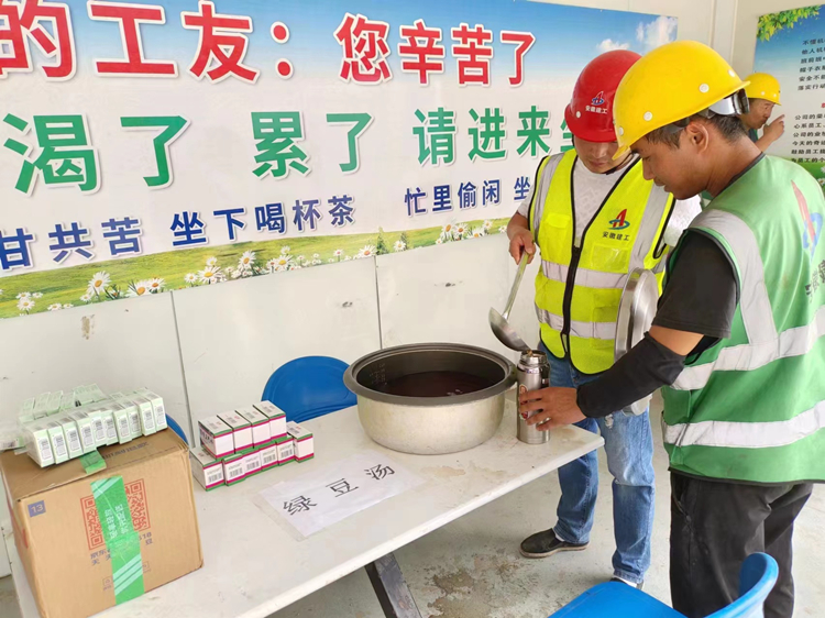 所有的安全活动是为了更好的,更放心的生产,实现安全和发展的良性循环。进入6月后,天气逐渐炎热,多日持续高温,项目上为了确保工人施工安全,每日免费提供藿香正气水、仁丹和绿豆汤,并安排专人巡查,有因高温不适的工人,及时通知休息,确保安全高效的生产。