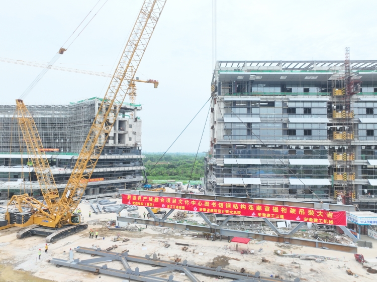 7月13日上午,肥西县产城融合项目文化中心图书馆钢结构连廊首榀桁架吊装成功,标志项目建设取得阶段性进展。