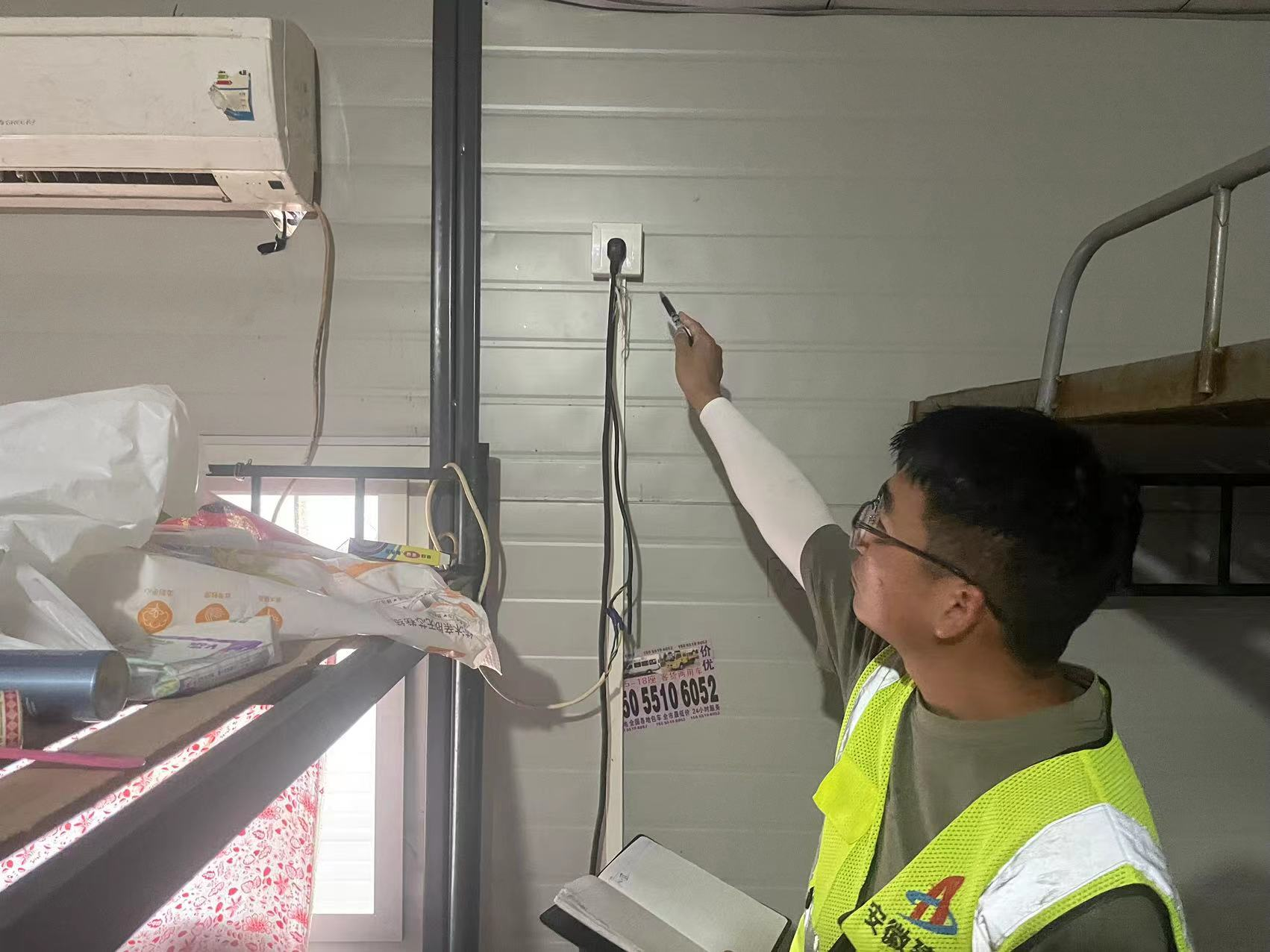 首先,由专职安全员对公共区域的临电设施进行检查,并向工人宣传用电知识,增强其安全用电、节约用电意识。查看公共部位所有的漏电保护开关、保险丝、盒、闸刀等情况,及时解决所发现问题,做到防患于未然。随后,检查公共区域的消防设施,对灭火器是否失效、配备是否齐全进行了排查,同时检查消火栓内消防水带和消防枪是否齐全、消防水是否可用等,对缺失的消防水带立即整改,保障生活区消防安全。