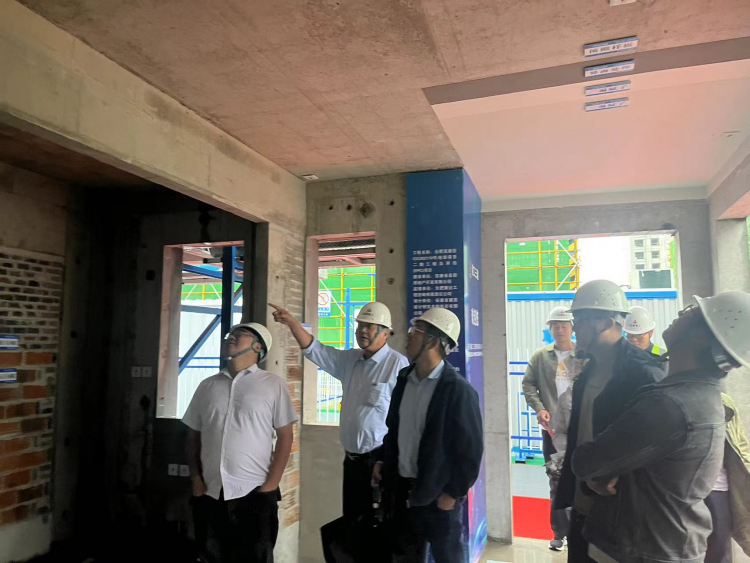 在时代星河二期项目部的观摩现场,参观过程中,观摩人员在项目负责人的带领下来到PC构件堆放区、质量集中展示区、智慧工地展示区和五号楼观摩区,认真了解了项目部在工程渗漏专项治理、样板引路标准化、混凝土施工质量管控标准化、装配式施工工艺等方面的内容。观摩人员边参观边思考,不时还互相讨论如何将被观摩项目在细部施工环节中好的做法和先进经验消化吸收,转化成为自己项目上的“好点子”,同时还不忘拿出手机,将每个亮点和细节进行拍照。