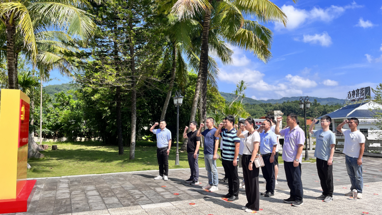 活动第一站来到了海南省定安县母瑞山革命根据地纪念园。在王文明、冯白驹将军铜像前,全体人员肃穆而立,静默哀思,庄重地向革命先烈三鞠躬,表达了崇高敬意和无限追思。随后,党员们面对党旗重温入党誓词,回忆入党初心,在铮铮誓言中坚定共产党员的政治信念和价值追求。在讲解员的带领下,大家还参观了琼崖革命斗争历史馆,共同追忆琼崖革命“二十三年红旗不倒”的光辉历史和革命先烈的英雄事迹,不仅加深了对母瑞山革命斗争的了解,也进一步坚定了不惧困难、不懈奋进、奋发图强的信念。