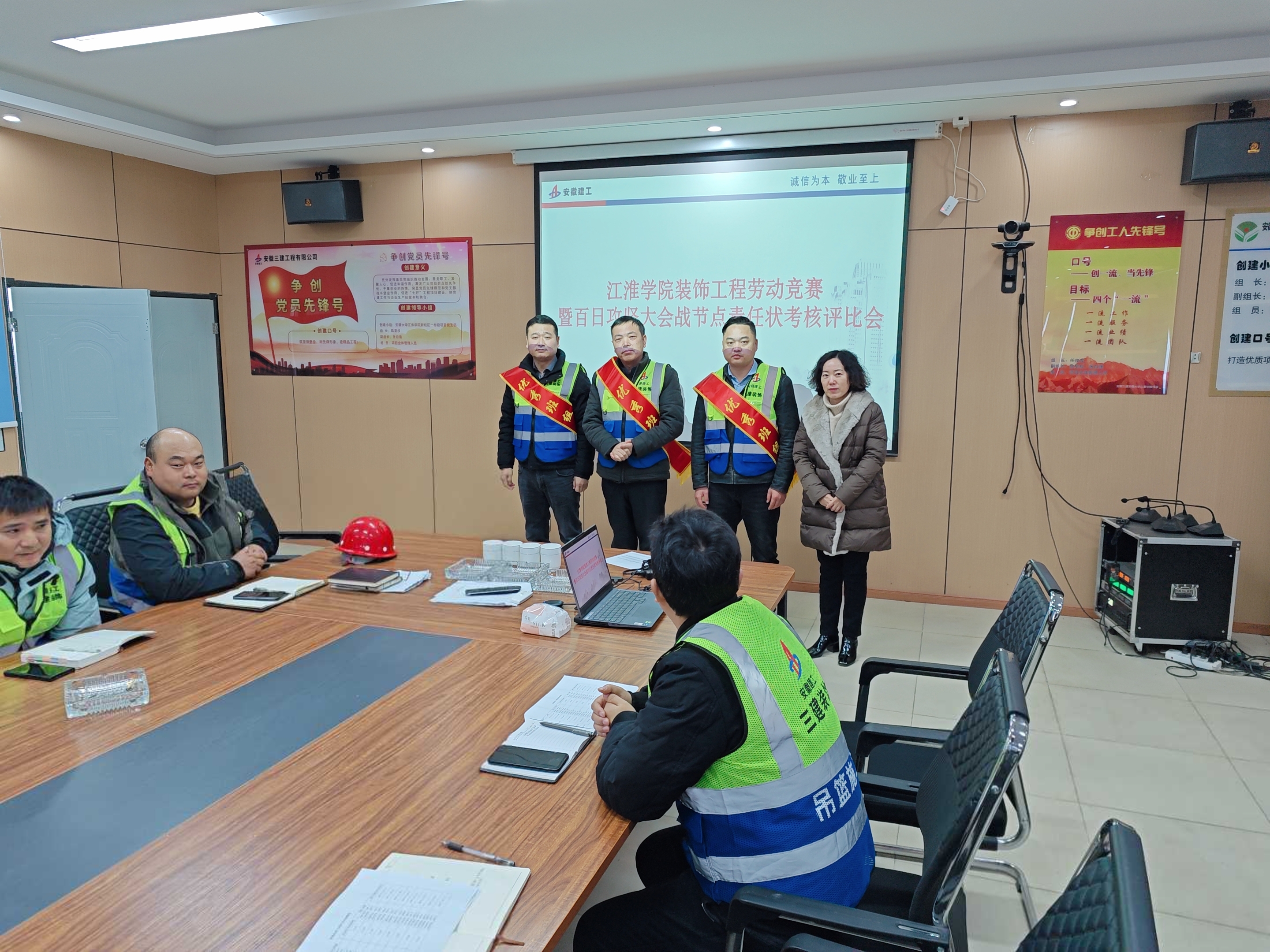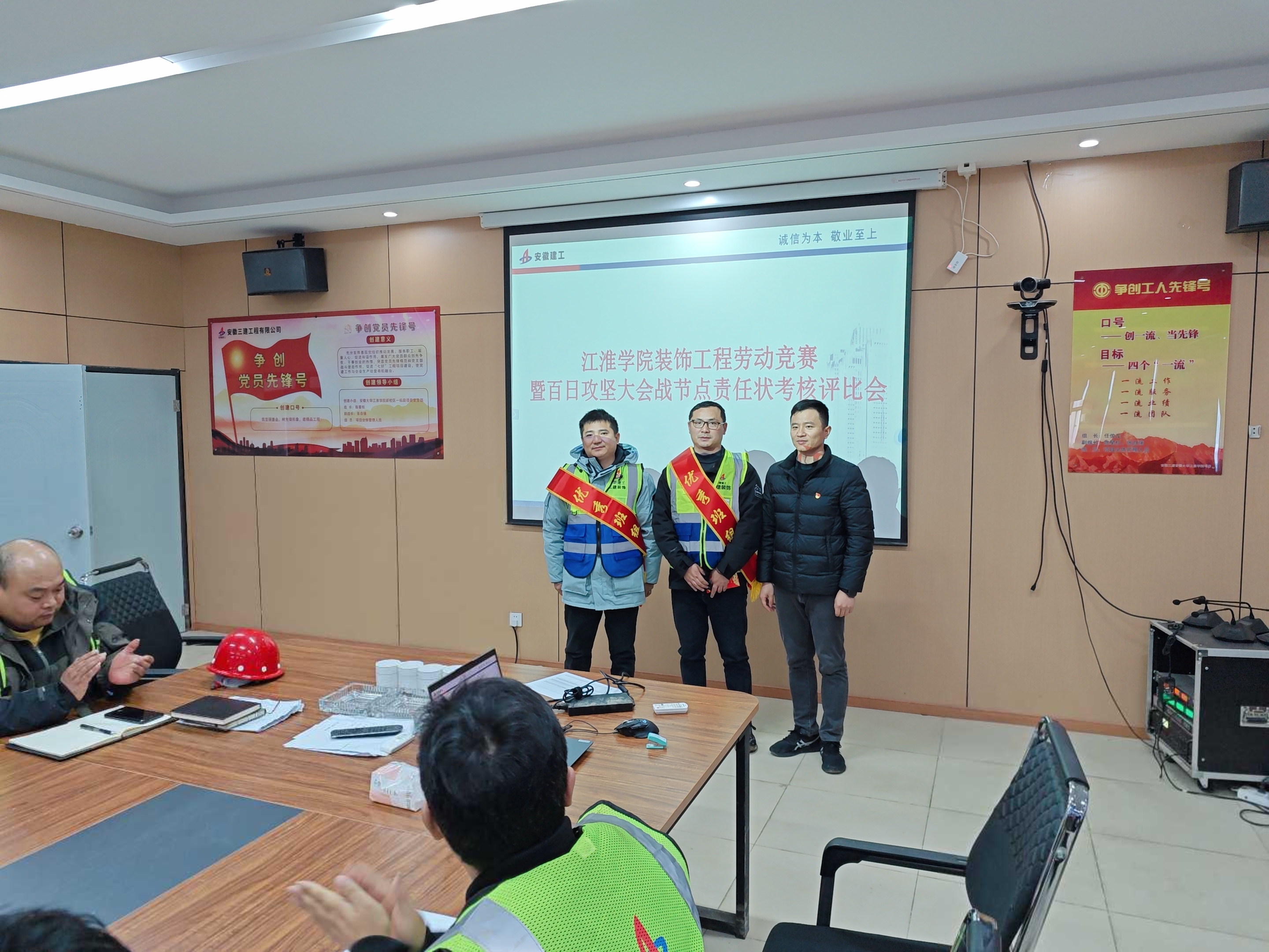 自项目劳动竞赛和百日攻坚战开展以来,合肥理工学院装饰项目部与班组签订责任状,明确目标,项目克服高温、雨雪天气、设计变更繁杂,样板选色定样多等多重困难,如期完成项目部署的节点目标。按照劳动竞赛 “六比六赛”的考核标准,项目对优秀班组进行了表彰。