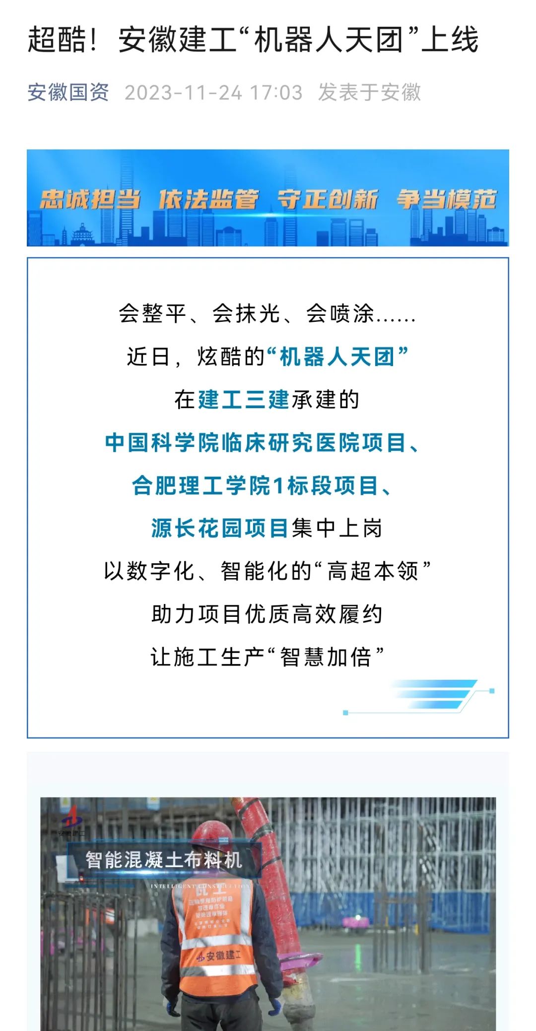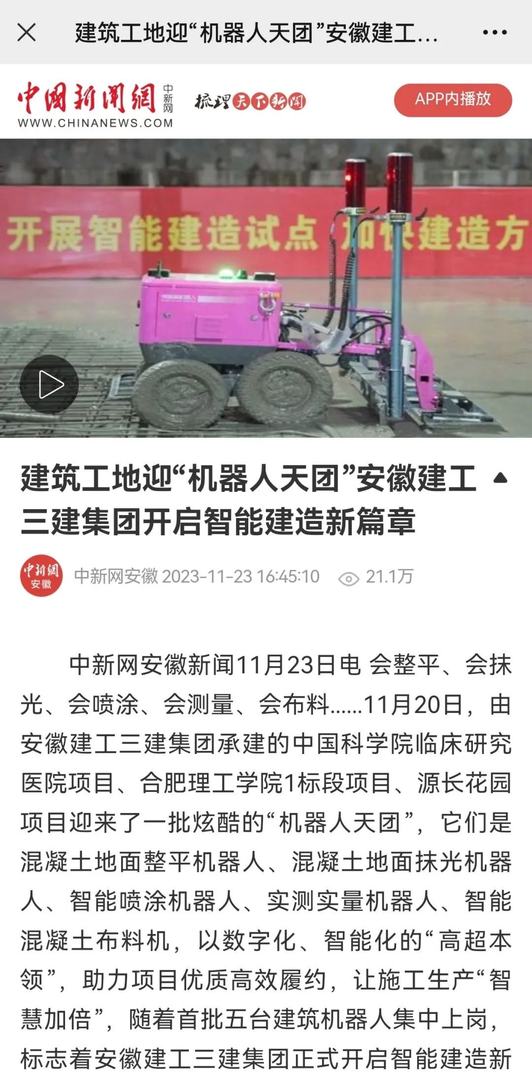 11月23日,中新网、安徽国资、合肥晚报以“建筑工地迎‘机器人天团’安徽建工三建集团开启智能建造新篇章”为题,专题报道公司首批引进五台建筑机器人助力项目高质量建设,开启智能建造新篇章,受到广泛关注。截至发稿时,阅读量已超20万次。