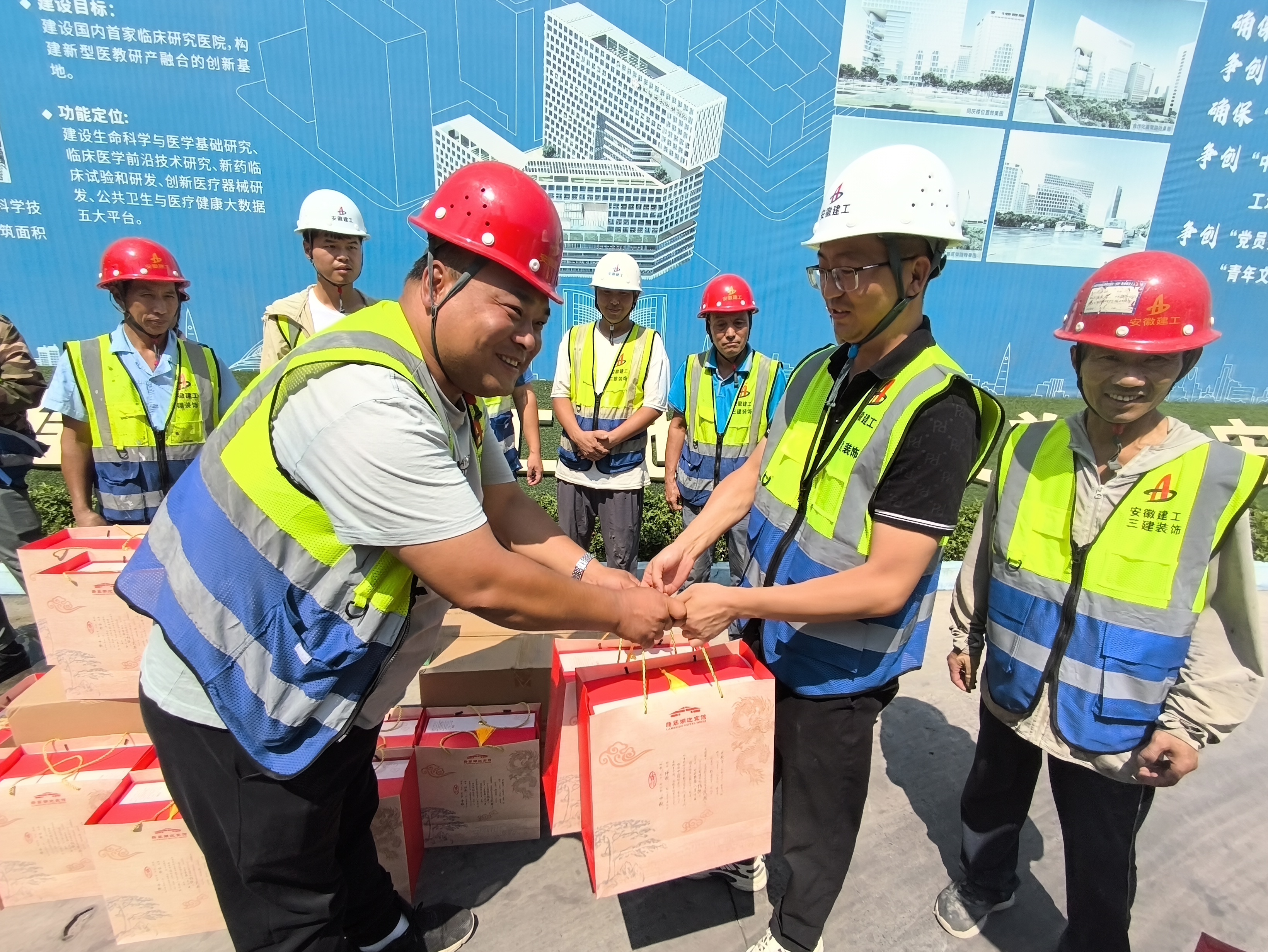 佳节“不打烊”,奋力“抢进度”。中科院项目建设者们抢抓工期,在这个阖家团圆的重要节日,主动放弃与家人团聚的机会,在项目上挥洒汗水、辛苦付出,为城市的现代化建设默默奉献着。装饰公司开展庆中秋慰问活动,为建筑工人们送上中秋月饼和中秋祝福。