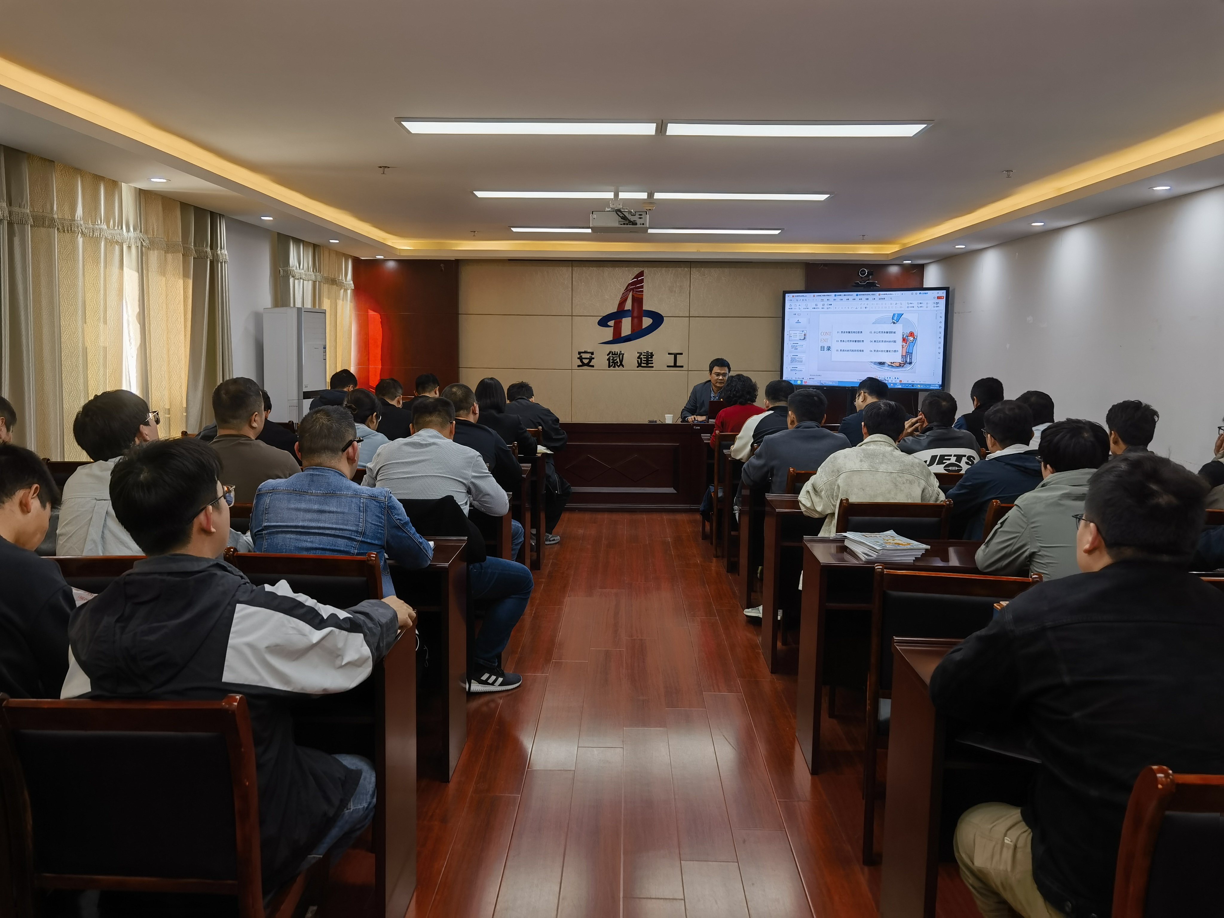 10月25日下午,装饰公司、安装公司联合举办了劳资工作专题培训会。本次培训会邀请了公司工程管理部副主任陈贵军主讲。装饰公司、安装公司班子成员、科室负责人及项目人员等共计40余人参加。