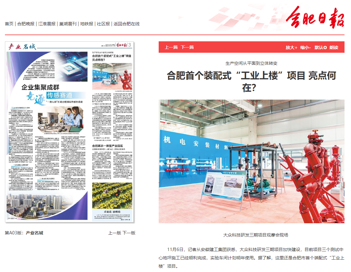 近日,合肥日报、合肥晚报等主流媒体聚焦报道公司承建的合肥市首个装配式“工业上楼”项目——大众科技研发三期项目亮点及最新进展,受到广泛关注。