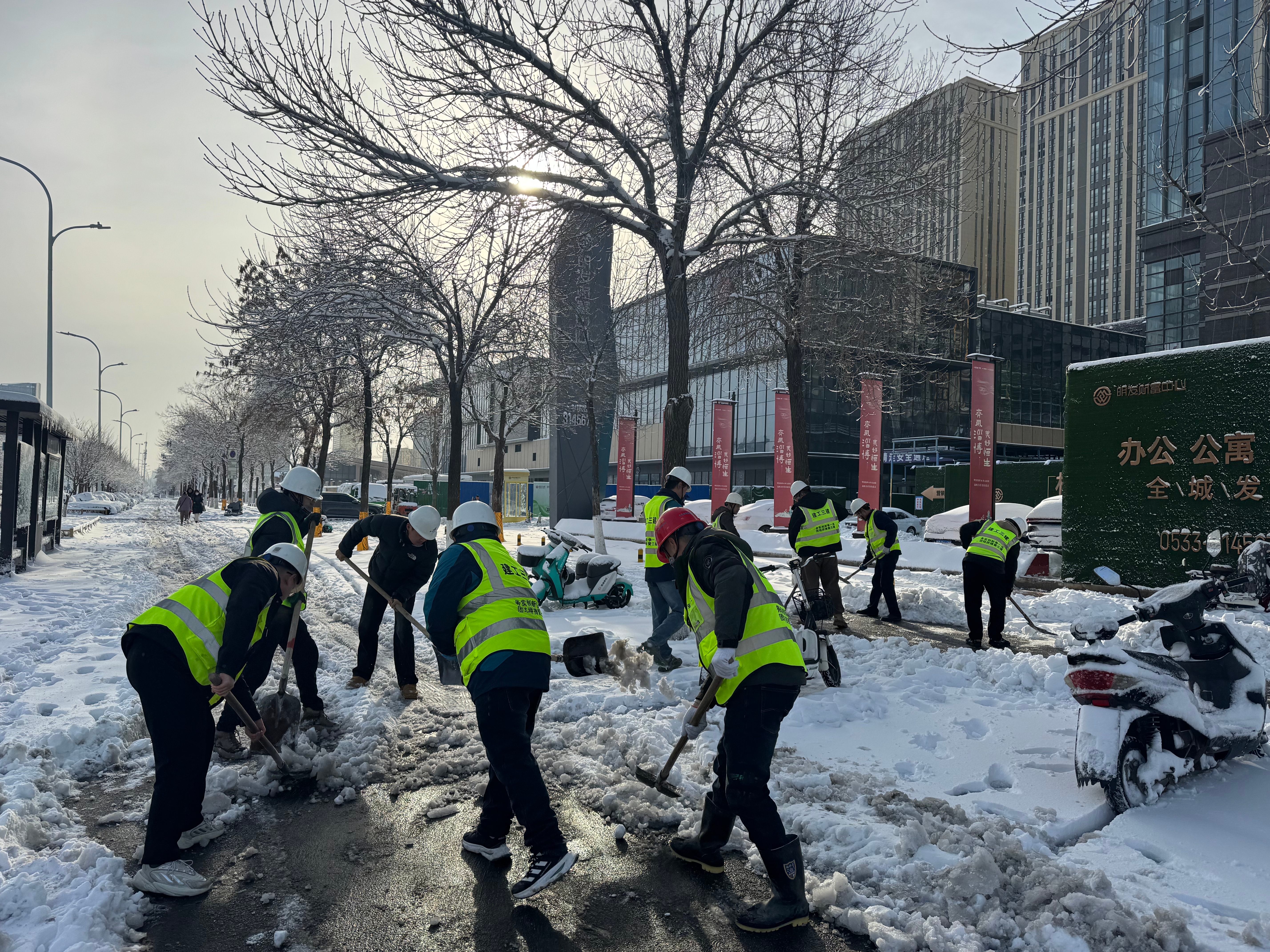 3月2日,淄博市迎来特大降雪,厚厚的积雪严重影响居民出行及淄博明发世贸中心项目的施工安全。面对极端天气,项目党员同志充分发挥党员先锋模范作用,组织全体管理人员立即开展铲雪除冰行动。