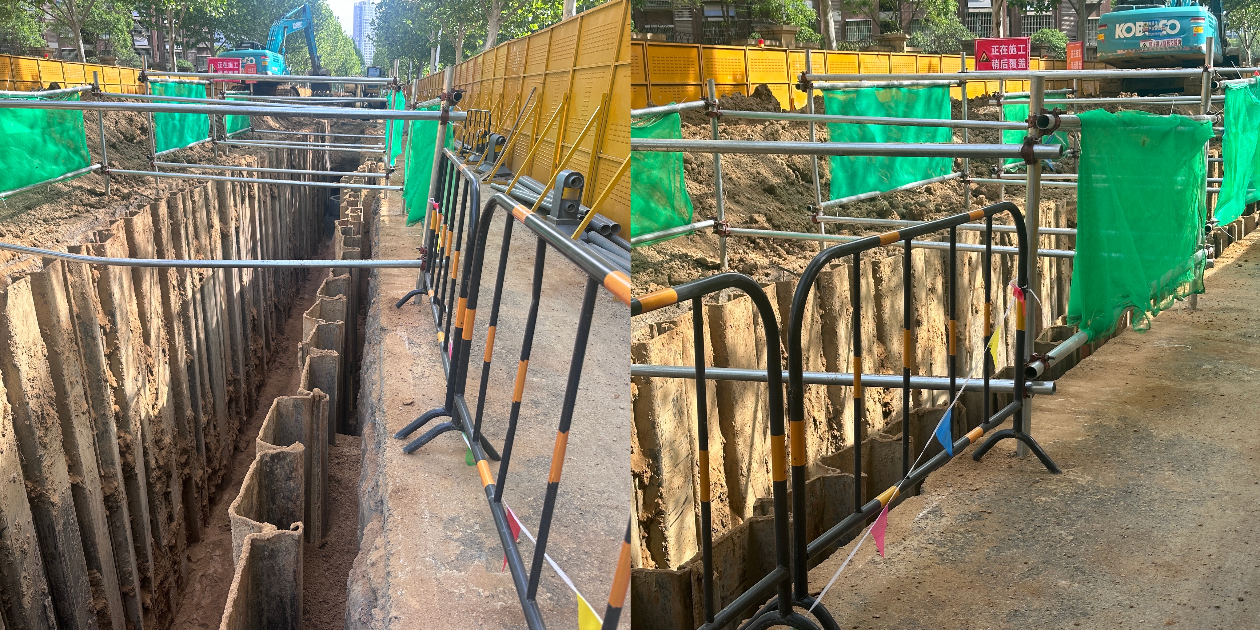 在市政道路雨污改造工程中,沟槽临边防护固定难题一直是施工安全管控的重点。徐河4标项目部立足实际,创新推出“钢管搭接 + 安全网” 组合防护体系。该体系通过科学设计钢管搭接结构,极大增强了防护架的稳固性,有效降低作业人员坠落风险;模块化的设计理念,使其能根据不同沟槽断面尺寸灵活调整,显著提升施工适应性。这一创新防护措施,为项目安全、高效推进构筑起坚实可靠的安全屏障。