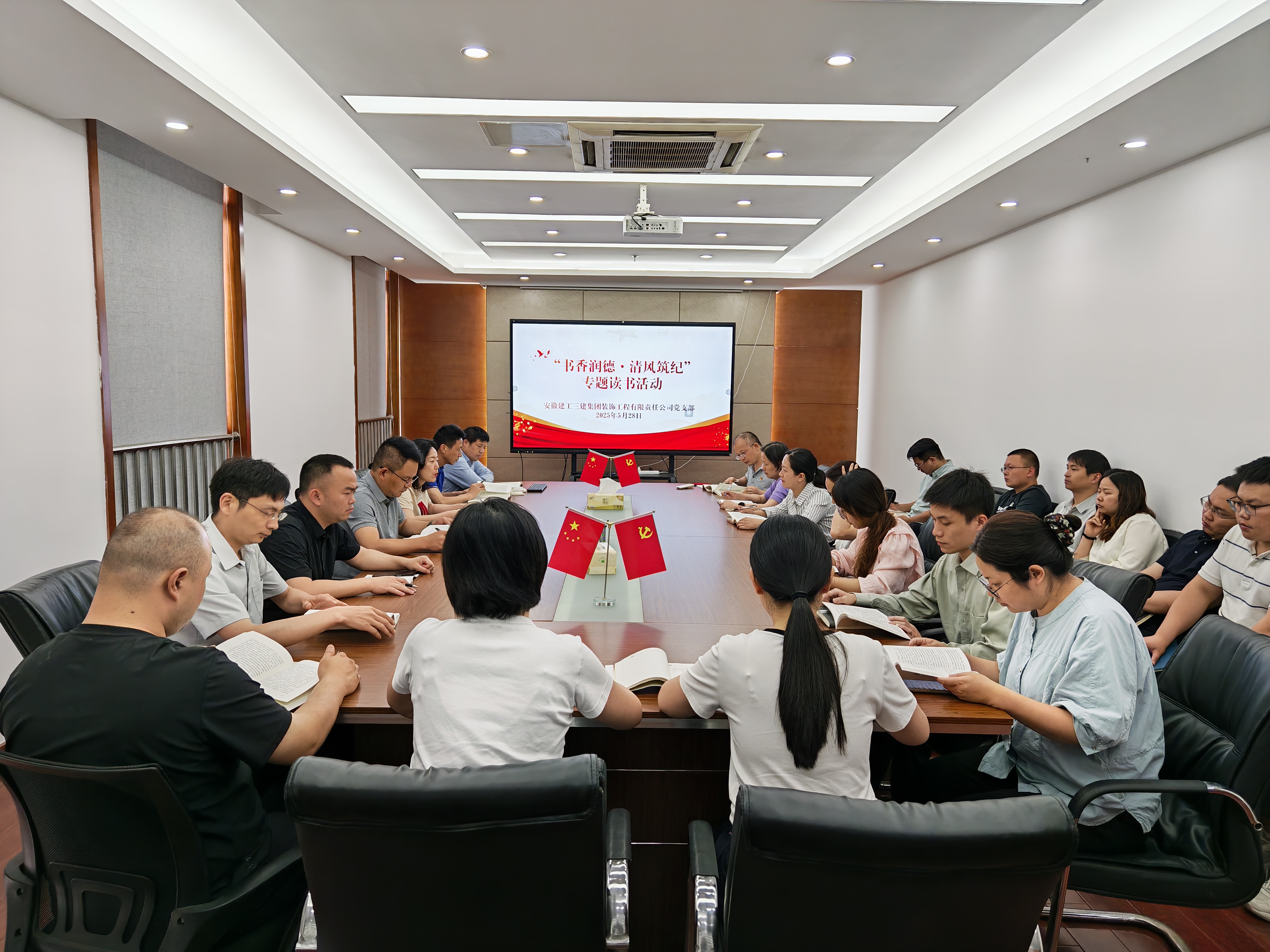 5月28日,装饰公司在会议室组织开展了“书香润德·清风筑纪”专题读书活动,分公司机关和项目共20余人参加。