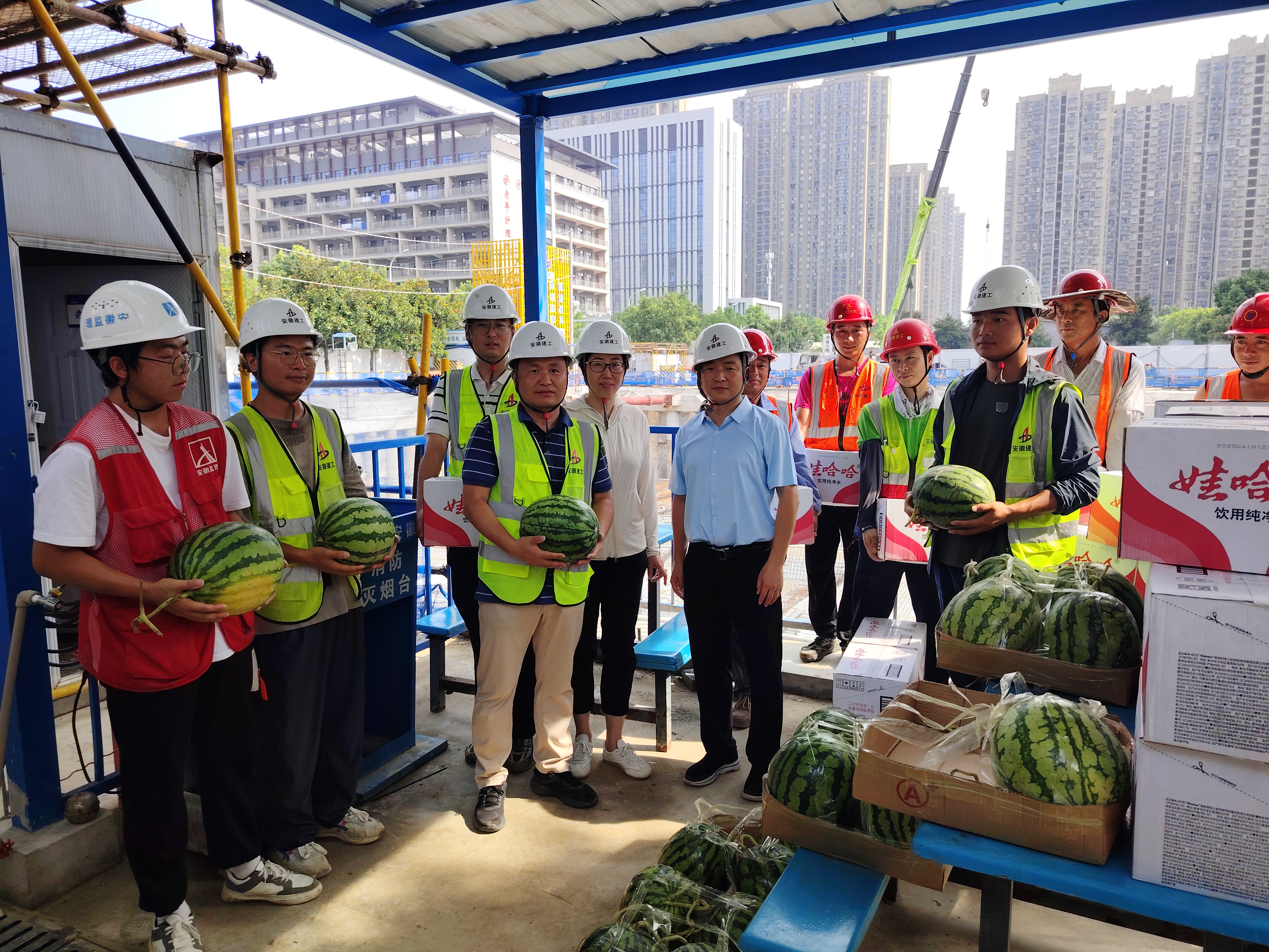 在项目施工现场,陈华一行为工人们送上精心准备的防暑降温物资,包括甘甜多汁的西瓜、清凉解渴的矿泉水以及藿香正气水等防暑药品。陈华亲切询问工人们的工作和生活情况,叮嘱大家要合理安排作息时间,切实做好高温防护,确保身体健康和施工安全。