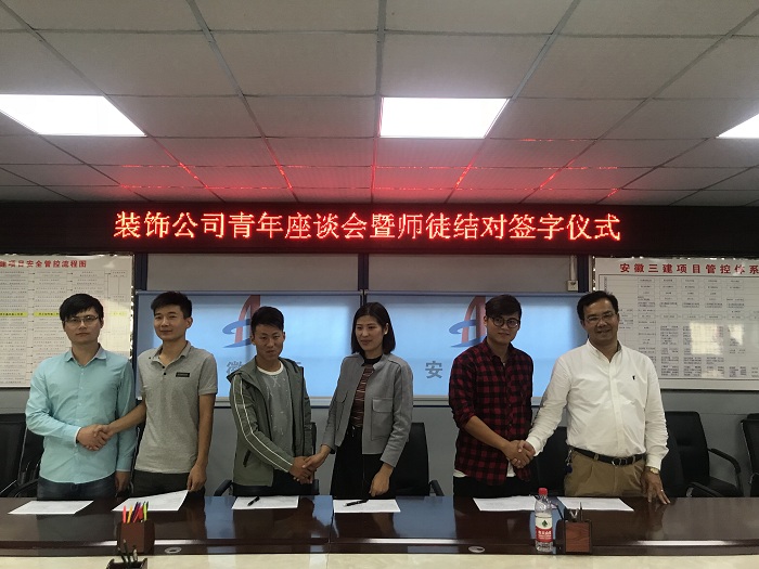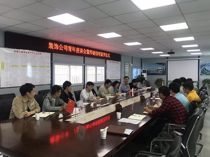 为了调动装饰公司青年职工的工作热情和积极性,切实帮助青年职工解决工作和生活中的实际问题,10月12日下午,装饰公司团支部在创新馆项目部会议室召开以“沟通交流,相互学习,共同进步”为主题的青年职工交流会,并开展“师徒结对”活动。公司经理万和生、党支部书记高莉、副经理王皖、孙一甲及所有青年员工参加了交流会。