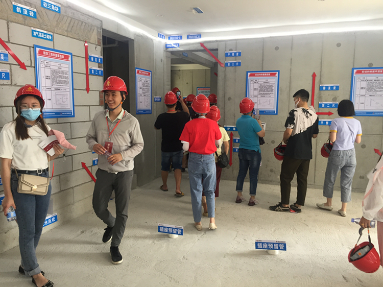 在项目管理人员的引导下,业主们依次检测体温,有序签到后,首先观摩了项目VR安全体验馆,感受安徽三建对安全工作的高度重视。随后,大家一起参观了样板间铝模支撑体系、爬架体系、PC预制梁板、涂料施工、地下室防水、砌筑、卫生间、屋面样板等,项目经理详细介绍了本项目各项工程施工细节及施工工艺,并对内墙涂料,剪力墙薄抹灰,螺杆洞封堵等十余种工艺进行了公开展示。