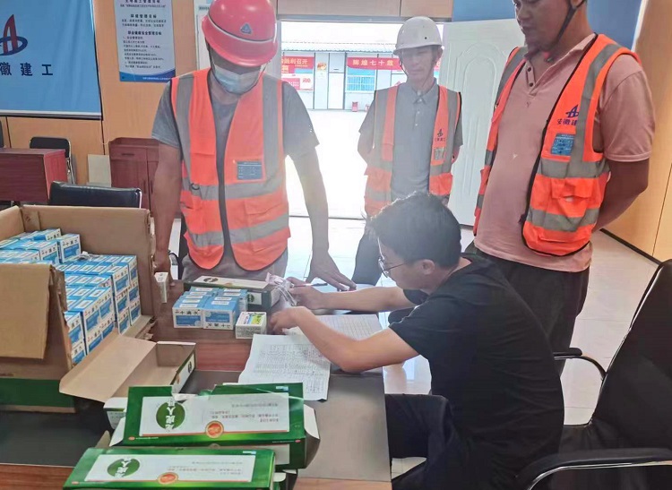 骄阳似火,热浪袭人。为认真做好高温天气劳动保护工作,切实维护参建工人的职业安全与健康权益,深入落实安全生产月活动,近日,七公司组织在肥地区项目开展“送清凉”活动。本次活动涉及合肥一中东校区和御景黄城两个项目、近30个班组,约1400名民工。发放的防暑降温物品包括人丹、十滴水、清凉油及藿香正气口服液等,合肥一中东校区项目每天还为班组工人发放两次雪糕冷饮。在发放现场,项目管理人员详细告知工人药品使用方法与功效,并细心叮嘱工人夏季要注意防暑降温,防止中暑。