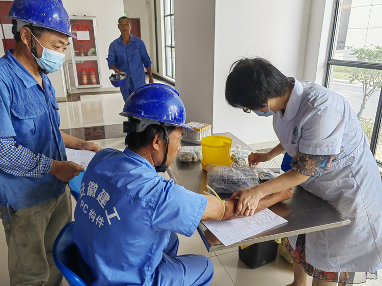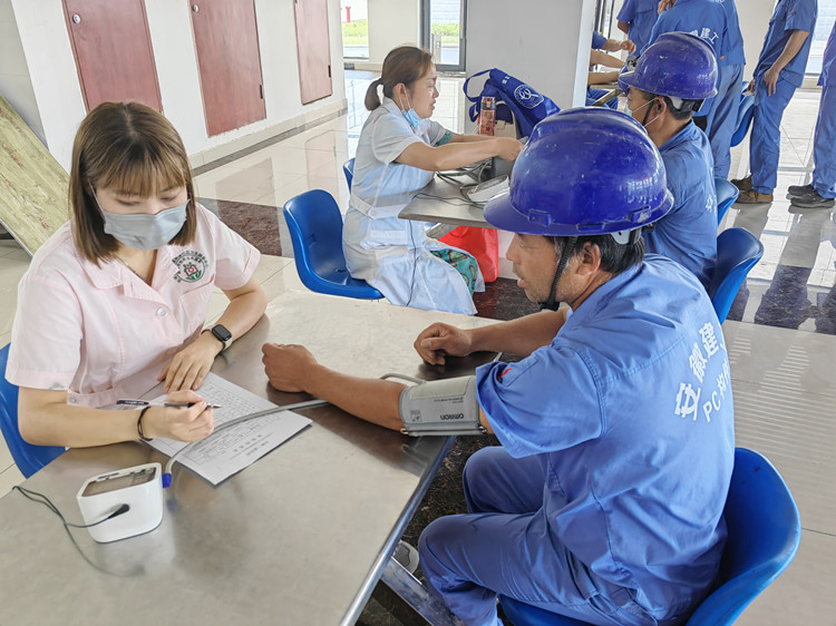 为了不耽误生产工作,体检医护人员一早便来到临时组建的体检会场,以50岁为年龄界限分为两组。体检项目主要是外科检查、血压、血糖、血常规、心电图等项目。体检过程中,医护人员详细地询问了受检者的身体状况、工作工种,同时对受检者的健康咨询给予详细解答,提醒受检者在夏季高温生活饮食和工作习惯等方面的注意事项。工人们纷纷表示:“像我们长期在外工作的,想不起来也舍不得花钱体检,公司可以给我们提供免费体检,真的是为民服务的好事!”