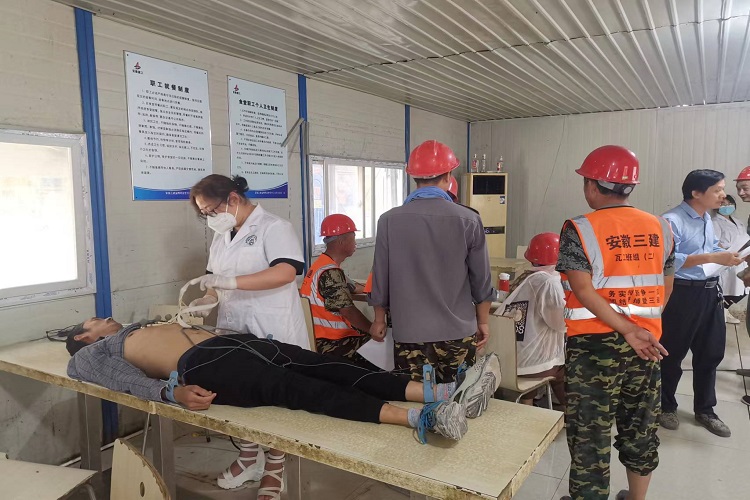为提高广大职工在高温天气下作业的自我预警和保护意识,切实关爱员工生命健康,7月9日,上海公司邀请芜湖路街道社区卫生服务中心(原安徽三建职工医院)六名医生进入项目部为员工进行健康体检。