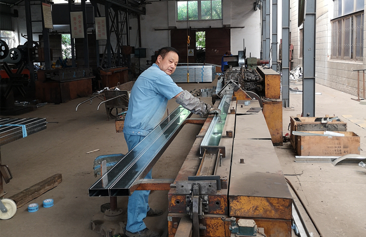 图为:龙骨车间共产党员曹雷师傅正在操作生产龙骨产品