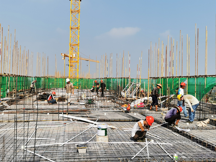 为了按时完成甲方的预售节点,迅速推进工程进度,分公司上下齐心协力。一方面,分公司副经理鲁豫、孙刚不间断地蹲点项目,统筹协调项目重难点工作,合理调配现场人材机,并抽调收尾项目项目经理、技术负责、生产经理等5名骨干人员到该项目,他们主动分片包干,保栋号、抢进度,经过25天的艰苦努力,成果显著,满足施工节点要求;另一方面,项目积极协调桩基单位夜以继日,迅速出土,每天保持6台以上施工挖机,木工班组和钢筋班组每栋楼人数维持在40人以上,确保一天完成一栋基础。重点工序采取24小时两班倒作业,做到“人歇机不歇”。为了不影响第二天钢筋绑扎,防水施工通常是通宵加班完成。在塔吊、汽车吊覆盖不到的地方,大家就手提、肩抗,晚上钢筋绑扎完成,就马上浇筑砼。此外,各项工序均要求班组长根据施工进度计划目标做好施工计划安排,确保各工序的衔接和工序循环,并针对每天完成的实际情况,实行动态调整。