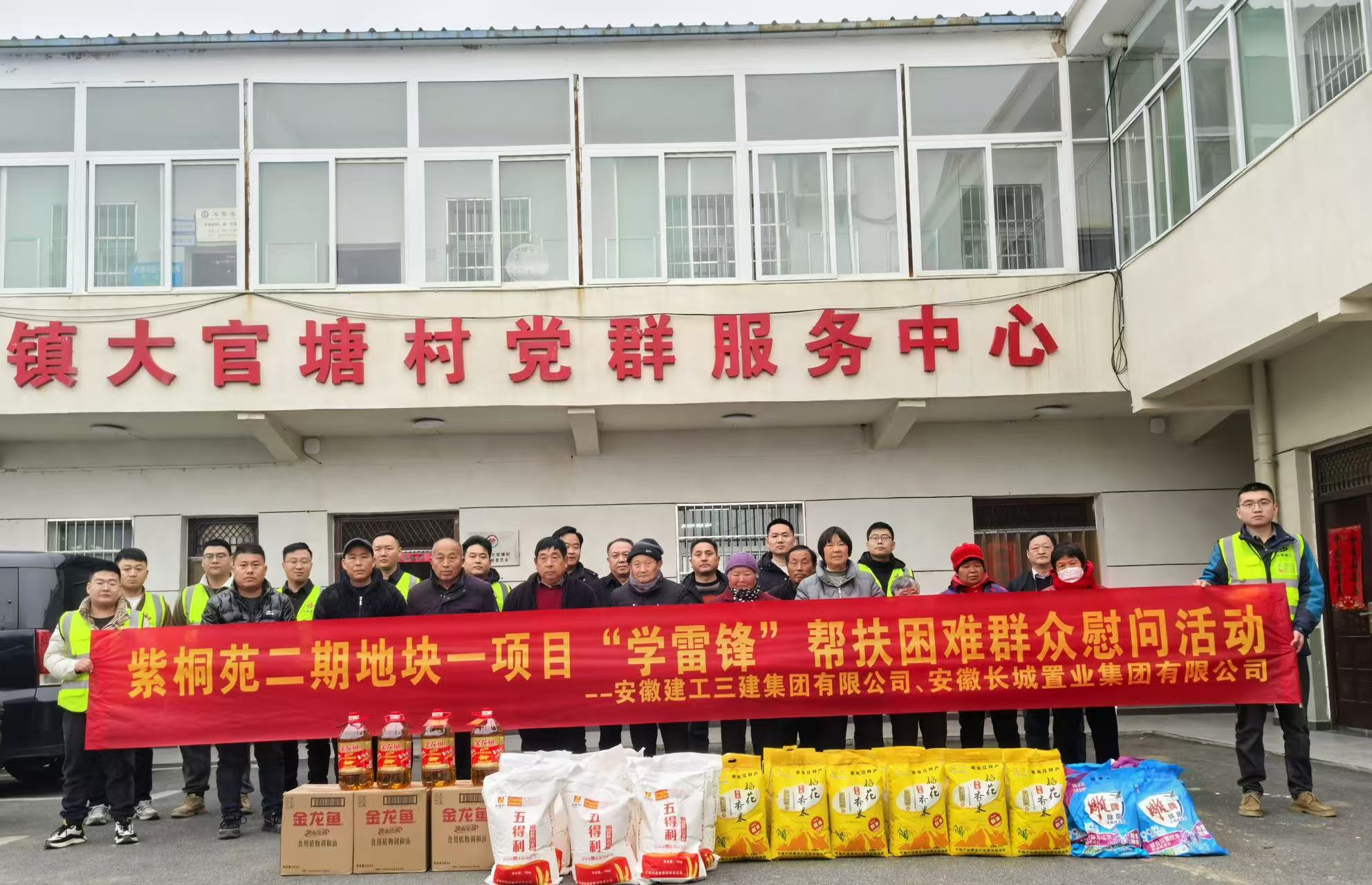 十分公司紫桐苑二期地块一项目党支部联合双墩镇人民政府村镇规划建设办、安徽长城置业集团有限公司组织项目管理人员前往长丰县双墩镇大官塘村委会开展“学雷锋”帮扶困难群众慰问活动,为困难群众送去了米、油、面等生活物资,并与他们亲切交谈,帮助人民群众解决生活困难,鼓励他们保持乐观心态。